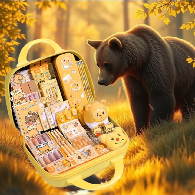 Тематичний набір канцелярії, виконаний у теплих коричневих тонах. Всі елементи прикрашені зображеннями милого ведмедика та його друзів.