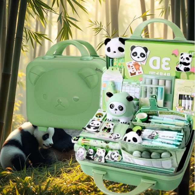 Стильний набір у зелено-білій гамі з кумедними пандами. Включає все необхідне для творчості та навчання в єдиному дизайні.